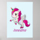 Personalisiertes Poster mit weißem Flügeldrachen mit rosa Mane, Schwanz und Hufen. Das Horn hat Ringe in Regenbogenfarbe und sieht aus wie ein lollipop mit Süßigkeiten. Dieses niedliche Einhorn zieht sich auf den Hinterbeinen auf. Das süße rosa Herz auf der Wange und die langen gürteligen Wimpern.