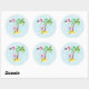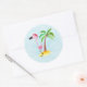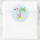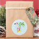 Aufkleber mit einer niedlichen Abbildung eines rosa Flamingo mit einer roten Weihnachtsmannmütze. Stehend auf einem Sandstrand mit tropischer Palme. Hellblauer Hintergrund.