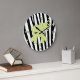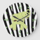 Niedliche Kinderwandtüte mit Cartoon wie Grafik eines grünen und weißen Elefanten, gegen ein schwarz-weißes Zebrastreifen-Muster. Zahlen und Punkte, die Stunden darstellen, sind grün. Eine wunderschöne Uhr, die dem Zimmer Ihres Kindes eine Dekoration verleiht.