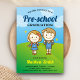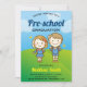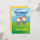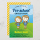 Erleben Sie Ihren Abschluss mit diesem niedlichen Vorschulaufenthalt mit niedlichen Schülern und moderner Typografie vor einem sonnigen Hintergrund. Fügen Sie einfach Ihre Veranstaltungsdetails zu dieser einfach zu bedienenden Vorlage hinzu, um sie zu einer einmaligen Einladung zu machen. Dreh die Karte um, um ein gelb-weißes Streifen-Muster auf der Kartenrückseite zu erkennen.