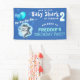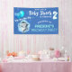 Niedlicher Hai zum Thema Geburtstag Banner, mit einem Hai mit einem Haufen blauer Ballons, mit Party-Streamer, der Text "Unser kleiner Hai dreht sich - Alter hinzufügen", und ihren Namen.