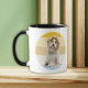 Ein Portrait eines zauberhaften, braunen und weißen Shih Tzu Dog ist das Feature auf dieser Tasse. Das Bild wird auf einem Retro-Hintergrund mit leicht bedrücktem Gold, Bräune und blauem Streifen platziert und zweimal auf der Tasse gedruckt. Ihr Name ist in einem schwarzen Skript zwischen den Bildern.