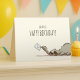 Ein lustiger Schlampe kommt spät mit einer verspäteten Geburtstagskarte. Verwenden Sie "Personalisieren Sie diese Vorlage", um den Text "(BELATED) HAPPY BIRTHDAY!" zu optimieren und eine einzigartige, angepasste Karte zu erstellen. Mit einem Cartoon eines niedlichen, schläfrigen Schläfchens, der in der ausgestreckten Klaue einen Geburtstagsschlauch sieht. Besser spät als nie!