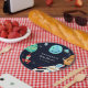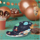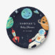 Niedliche Raum Thema Baby Dusche Papier Platte mit Kreuz Kunst der Planeten, Rakete, Astronaut, UFO, Sterne in der Galaxie. Passen Sie dieses Produkt an, indem Sie den Namen der künftigen Mutter hinzufügen. Ideal für eine Babydusche.