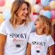 Shows "Spooky Mama" in Halloween schwarz und orange und eine niedliche schwarze Spinne. Holen Sie sich das passende Spooky Girl, Spooky Boy und Spooky Vater Familiendesign. Eine coole, trendige und stilvolle Art, Herbst und Halloween-Feiertag zu feiern.