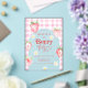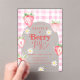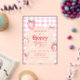 Das Design bietet weiche Rosa- und Rottöne mit Gingham-Hintergrund. Zusammen mit bezaubernden Strawberry und Molkereien. Eine fette Serif für 'Berry' gepaart mit einem Script-Schriftart für 'first' schafft einen spielerischen und auffälligen Mix.