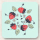 Niedliche Erdbeeren Untersetzer mit einer Vektorgrafik, die 5 fröhlich lächelnde Erdbeerfiguren darstellt, die in einem Kreis tanzen, umgeben von Blätter und Blume ihrer Art. Fun Design mit einem Federgeist für eine Person, die diese leckeren Früchte Lieben.