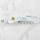 Niedlicher Korkenzieher mit gelbem Sonnenblumenbild. Set auf einem blauen Hintergrund, können Sie schwarzes Skript mit Ihren eigenen Informationen anpassen. Ideal, um Ihren Getränkedosenzubehör einen persönlichen Stil hinzuzufügen.