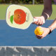 Niedlich tanzende Apfel-Cartoon-Abbildung Pickleball Schläger