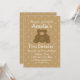 Ein niedlicher Grizzly-Teddy-Bär, der zum ersten Geburtstag die Einladung zum Baby bekommt. Hintergrund ist braune und polka Punkte Muster.