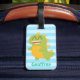 Kinder, die niedliche Dinosaurier und prähistorische Themen Liebe haben, werden diesen kawaii Gepäckanhänger mit seinem Cartoon von grün und gelb Dino mit abgerundeten Spitzen, die so glücklich lächeln, dass man auch nicht widerstehen kann zu grinsen. Hellblaue Streifen als Hintergrund. Dieses farbenfrohe, bezaubernde und attraktive Dinosaurier-Design ist für kleine Kinder und Kleinkinder geeignet, um ihre Schultaschen zu personalisieren. Personalisieren Sie einfach den Namen des Kindes.
