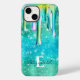 Niedliche hübsche Iridescent türkise Tropfen Imitate Glitzer Monogramm I-Phone Gehäuse bietet modernen Glitzer Luxus Chic Girly Shimmer unicorn Regenbogen Iridescent Blue Oean Glitzer und holografischen Tropfen. Schönes, modernes und cooles Cover für Mädchen, die klassische funkelnd Designs genießen. Zeigen Sie Ihren persönlichen Stil, sehen Sie modern, trendig und fühlen Sie sich stilvoll mit einem einzigartigen Design auf einem mobilen Gerät Zubehör oder passen Sie es über ein anderes Produkt Ihrer Wahl. Fügen Sie Ihren Namen mit einer coolen und modernen kalligraphischen Typografie hinzu. Es ist die perfekte Geschenkidee für einen süßen 16 Geburtstag, Hochzeit, Brautparty, Jubiläen, Babyduschen oder Junggeselinnen-Abschied, Valentinstag oder als Geschenk im Allgemeinen.
