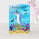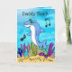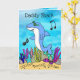 Glückliche Vatertagskarte mit einer coolen Sonnenbrille mit Papageienhai, umgeben von Ozean und Korallen.