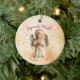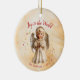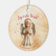 Ein niedlicher Vintager Porzellanenengel ist auf einem cremefarbenen und goldenen Aquarell inmitten eines Sprinkels von Weihnachtsstars zu sehen. Das macht einen zauberhaften Baum-Ornament aus. "Joy to the World" ist in roter Schrift, die Sie ändern können, wenn Sie einen anderen Satz bevorzugen. Stellen Sie sicher, dass Sie den Familiennamen und das Jahr nach Ihrer Wahl ändern.