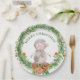 Ein niedlicher Schneemann in Pastellfarben und ein Rahmen von grünen Tannenarmen mit Kiefernzapfen und Orangenholzbeeren