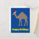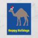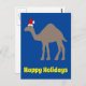 Diese niedliche Weihnachtspostkarte zeigt ein digitales Kunstbild eines niedlichen sandfarbenen, braunen Dromedary Kamels mit schönen langen Wimpern und einem Single-Höcker auf dem Rücken. Das Kamel ist zum Weihnachtsfeiern mit einer rot-weißen Weihnachtsmannmütze auf dem Kopf gekleidet. Das Kamel ist in der Bibel zu sehen und ein traditionelles Symbol für Weihnachten. Auf der Vorderseite befindet sich ein eigener Text, damit Sie Ihre Postkarte mit einer Nachricht Ihrer Wahl personalisieren können. Die Standardnachricht lautet Happy Holidays.