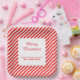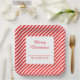 Niedliche Teller aus weißem und rot gestreiftem Papier. Es ist sehr einfach, Ihre persönlichen Daten mit Details zu versehen.