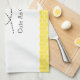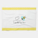 Ein Küchentuch mit einer niedlichen Hummelbiene, die durch das Verlassen einer Spur summt, die ein Herz bildet. Ein Hexagonbienenwabenmuster als Grenzdekorationen. Der Text liest "niedliches, wie Biene kann".