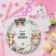 Adorable Sweet Woodland Babydusche Teller. Das Design zeichnet sich durch niedliche Aquarelltiere aus, darunter botanische Herbstfloralen und Blattpflanzen, Pilze, Schmetterlinge und eine anpassbare Vorlage.