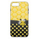 Stilvolle iPhone 7 Plus Gehäuse, mit einem gelben und weißen Damast-Muster, oben auf dem Gehäuse und unten mit einem gelben schwarzen Polka-Dot-Muster. Die Grafik eines schwarzen Bandes und Bogens verläuft zwischen den beiden Hintergründen quer durch das Gehäuse und ist mit Grafiken eines gelben und schwarzen Ladybugs dekoriert. Hübscher Weg, um Ihr iPhone 6 zu schützen und auch stilvoll aussehen, und macht eine tolle Geschenkidee.
