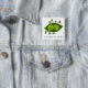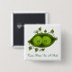 Niedliche Abbildung von zwei runden grünen Cartoon Erbsen, die bequem in einer grünen Hülle sitzen. Jede Erbse hat ein süß lächelndes glückliches Gesicht. Über und unter der Hülle sind Reben mit Blätter. Auf der Unterseite des Abzeichens und unter dem Design sind die Worte "Zwei Erbsen in Pod" in grünem Text.