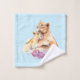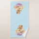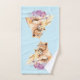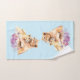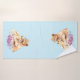 Handtuchhandtuch mit einem niedlichen Aquarellbild von einer Mutter Löwe, die ihren Babykrug hält. Ein hübscher, lila Blumenstrauß unter ihnen fügt diesem süßen und zauberhaften Bild eine sanfte Touch hinzu. Hellblauer Hintergrund.