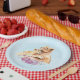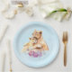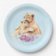 Papier Teller mit einer niedlichen Aquarellmalerei von einer Mutter Löwe, die ihren Babykrug hält. Ein hübscher Blumenstrauß unter ihnen, fügt eine sanfte Touch zu diesem süßen und bezaubernden Bild hinzu.