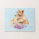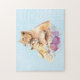 Ein Rätsel mit einem niedlichen Aquarellbild eines Mutterlöhnen, der ihren Babykrug hält. Ein hübscher, lila Blumenstrauß unter ihnen fügt diesem süßen und zauberhaften Bild eine sanfte Touch hinzu. Hellblauer Hintergrund.