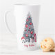 Eine niedliche latte Tasse in Rot, Schwarz und Grau. Das Design, das auf beiden Seiten gezeigt wird, zeigt eine Aquarellbilder eines Pinguins, der unter einem Weihnachtsbaum schläft. Frohe Weihnachten ist in einem roten, handgeschriebenen Skript