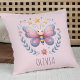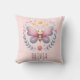 Dieses personalisierte Kissen mit einem lächelnden Schmetterling mit atemberaubenden rosa und grauen Flügeln umgibt dieses charmante Kissen.