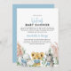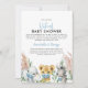 Niedliches Geschlecht unbekannte Baby Duschtiere in Masken covid virtuellen Babydusche. Weiße Blume botanisches Blattwerk und Elefant, Löwe und Zebra in Gesichtsmasken. Skripttext, Teil einer Sammlung, in verschiedenen Farben verfügbar.