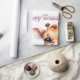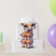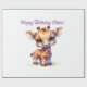 Ein niedliches Baby-Giraffe im Cartoon-Stil mit großen, ausdrucksvollen Augen und einem fröhlichen Lächeln. Es steht in einer spielerischen Pose, die allgemeine Stimmung ist fröhlich und skurril, perfekt für ein Kindergeschenk.
