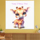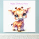 Ein niedliches Baby-Giraffe im Cartoon-Stil mit großen, ausdrucksvollen Augen und einem fröhlichen Lächeln. Es steht in einer spielerischen Pose, die allgemeine Stimmung ist fröhlich und skurril, perfekt für ein Kindergeschenk.