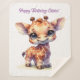Ein niedliches Baby-Giraffe im Cartoon-Stil mit großen, ausdrucksvollen Augen und einem fröhlichen Lächeln. Es steht in einer spielerischen Pose, die allgemeine Stimmung ist fröhlich und skurril, perfekt für ein Kindergeschenk.