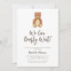 Die Einladung zur Babydusche ist mit einem niedlichen handbemalten Teddybär dekoriert. Im braunen Text steht: "Wir können frühzeitig warten!" Diese Einladung eignet sich hervorragend für eine geschlechtsneutrale Babydusche. Original Wasserfarbe © Michele Davies.
