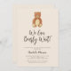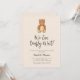 Die Einladung zur Babydusche ist mit einem niedlichen Teddybär in Aquarellfarbe auf cremefarbenem Hintergrund dekoriert. Im braunen Text steht: "Wir können frühzeitig warten!" Diese Einladung eignet sich hervorragend für eine geschlechtsneutrale Babydusche. Original Wasserfarbe © Michele Davies.