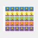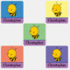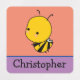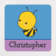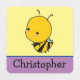 Niedliche, kawaii-gelbe und schwarze Biene, mit blauen, gelben, grünen, roten und lila Hintergründen. Eine Vorlage unten in einem lila Feld, um Ihren Namen zu personalisieren.