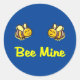 Zeigt zwei fliegende, niedliche, lächelnde Hummeln über den Worten "Bee Mine" in einem klassischen Retro-Skripttext. Dunkelblauer Hintergrund. Angenehme, lustige und bezaubernde Art, sich auszudrücken, sei es am Valentinstag, sei es, um sich zu entspannen. Stickers für Umschläge, Lunchtaschen, Notizen, Notizbücher, Geschenkverpackungen und vieles mehr.