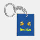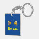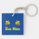 Zeigt zwei fliegende, niedliche, lächelnde Hummeln über den Worten "Bee Mine" in einem klassischen Retro-Skripttext. Tief blaue Hintergrundfarbe. Auf nette, lustige und bezaubernde Weise können Sie sich am Valentinstag oder zu jeder Jahreszeit ausdrücken. Ein tolles Geschenk für jemanden, der sich an dich erinnert, wenn er diesen Schlüsselanhänger mit sich trägt. Ein nützliches Geschenk.
