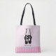 Tote Tasche mit einer schwarzen Abbildung einer Ballett-Tänzer Hausschuhe und ihre Beine. Ballerina ist auf ihren Zehen stehend, en pointe. Text sagt: Ballett Mädchen. Text kann einem Namen oder einem anderen Text Ihrer Wahl personalisiert werden, wenn Sie möchten. Der untere Rand und die Rückseite des Totenbeutels haben ein Muster aus weißen Polka-Punkten auf rosa.