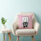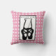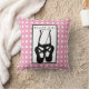 Ein Kissen mit einer schwarzen Abbildung einer Balletttänzerin Hausschuhen und ihren Unterschenkeln, die transparent sind und die Farbe des Gegenstands durch zeigen. Ballerina ist auf ihren Zehen stehend, en pointe. Text sagt: Ballett Mädchen. Text kann einem Namen oder einem anderen Text Ihrer Wahl personalisiert werden, wenn Sie möchten. Hintergrund ist ein Muster aus weißen Polka Punkte auf rosa.