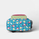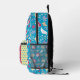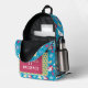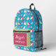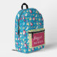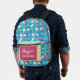 Dieser niedliche, blaue Rucksack weist ein hübsches weißes Muster mit bunten, gelben Schmetterlingen, Herzen mit weißen Bändern, hübschen rosa Blume und gelben Tasse auf einem fröhlich blauen Hintergrund auf. Personalisieren Sie Ihre Daten mit Ihrem Namen und einer anderen Beschreibungszeile.