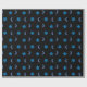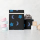 Exquisite Verpackungspapier, die ein handwerkliches Design von Sternen und Monden zeigt, handgezeichnet mit farbigen Stiften. Das Muster zeigt einen auffallenden Kontrast von blauen Sternen und lila Monden vor einem tiefen schwarzen Hintergrund.