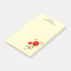 Personalisierte klebrige Noten mit einer skurrilen Abbildung mehrerer roter Blume mit großen Herzen an einem Stiel mit grünen Blätter. 2 uralte, gelbe Schmetterlinge, die sich in der Nähe bewegen. Hellgelber Hintergrund.