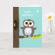 Niedliche, braune Eule und bearbeitbare Geburtstagwünsche auf der aquamarinen Geburtstagskarte.