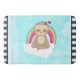 Eine niedliche Cartoon-Illustration eines meditierenden Schlamms. Eine Krone Wildblumen auf dem Kopf tragen, friedlich auf einer weißen Wolke schwebend, mit einem bunten Regenbogen dahinter. Ein paar Herzen in der Nähe. Friedlich und glücklich. Hintergrund ist ein hellblaues Grunge-Stil Bild.