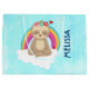 Eine niedliche Cartoon-Illustration eines meditierenden Schlamms. Sie trug eine Krone von Wildblumen auf ihrem Kopf und schwebte friedlich auf einer weißen Wolke mit einem bunten Regenbogen dahinter. Ein paar Herzen in der Nähe. Friedlich und glücklich. Der Hintergrund ist ein hellblaues Grunge-Bild.
