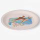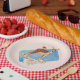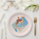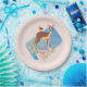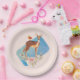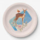 Teller mit hübschem braunem Hirsch mit weißem gepunktetem Rücken. Ein kleiner Vogel sitzt auf dem Rücken des Hirsches. Ein extravagantes Blumenstrauß mit Aquarellfarben-Rose und hellolivgrüne Blätter unter den Füßen des Hirsches. Ein blaues Aquarelleck hinter dem Bild. Innozentes und süßes Design mit rustikaler Eleganz. Pfirsichfarbener Hintergrund
