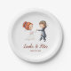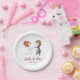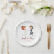 Überraschen Sie Ihre Gäste mit diesen personalisierten Hochzeitszettel-Tellern. Fügen Sie Ihre Namen und Details hinzu, ändern Sie den Schriftart oder die Farben. Die Abbildung stellt die Braut und den Bräutigam dar. Illustriert und entworfen von Patricia Alvarez.