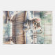 Eine hübsche Aquarellillustrierung eines köstlichen Kätzchens, das in einer rustikalen Holzwanne ein Schaumbad genießt, mit einer ruhigen Kulisse aus Pflanze und sanftem natürlichem Licht, das durch ein Fenster gefiltert wird.